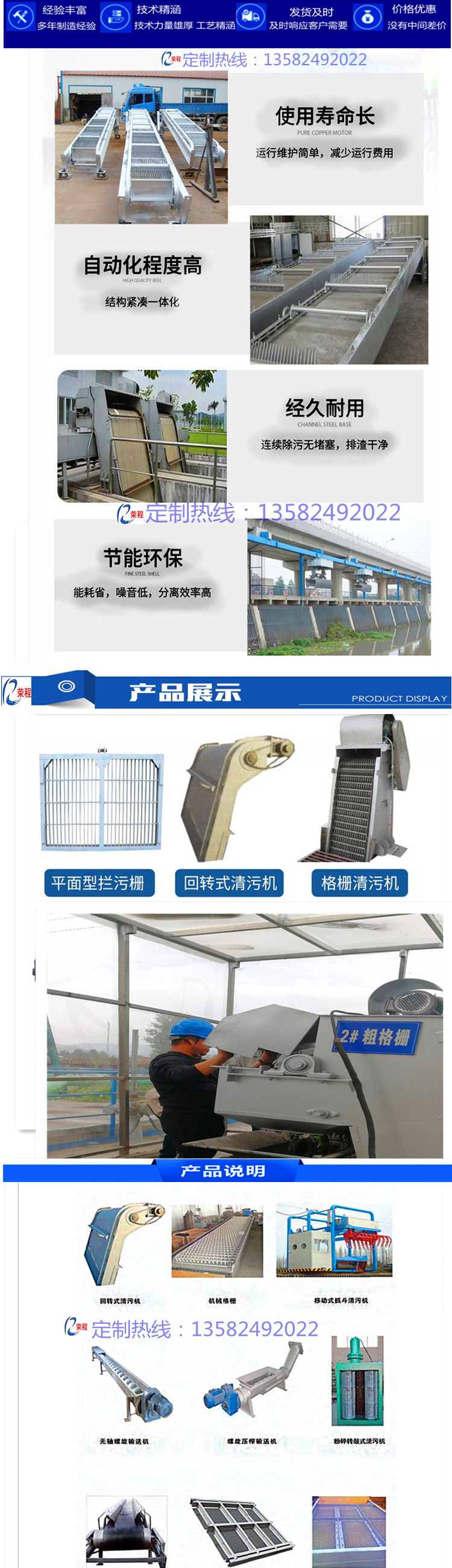 回轉式格柵除污機是一種可以連續自動攔截并清除流體中各種形狀雜物的水處理專用設備,可廣泛地應用于城市污水處理。自來水行業、電廠進水口,同時也可以作為紡織、食品加工、造紙、皮革等行業廢水處理工藝中的前級篩分設備。