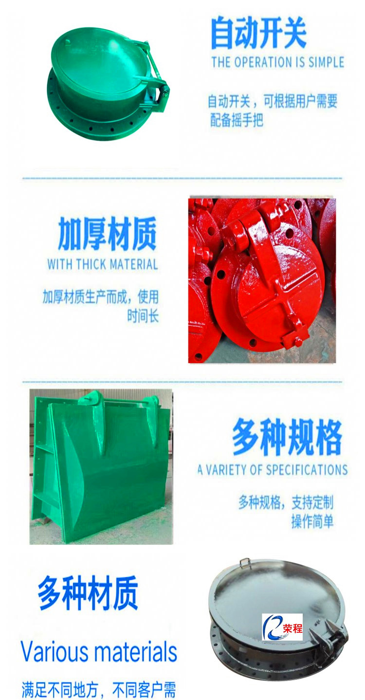 鋼制拍門具有流道正向單向開(kāi)啟和反向關(guān)閉的作用。拍門的閥蓋借助于自身配重的平衡作用,在水流的作用下使門頁(yè)自動(dòng)開(kāi)啟或關(guān)閉,或稍加外力作用使門頁(yè)開(kāi)啟或關(guān)閉;拍門蓋上設(shè)有拉環(huán),拉動(dòng)拉環(huán)此蓋的開(kāi)啟角度應(yīng)大于60度,無(wú)卡阻現(xiàn)象,開(kāi)關(guān)應(yīng)自由靈活,當(dāng)拍門部分泡在水中,管道內(nèi)部壓力較大,反向壓力較小時(shí),拍門允許部分泄漏量,當(dāng)河道水壓增大時(shí),拍門將自動(dòng)關(guān)閉密封。