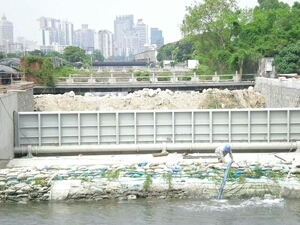 在水利水電建設(shè)中,隨著城市用水、景觀建設(shè)及環(huán)境整治和灌溉、發(fā)電的需要,翻板閘,水閘和橡膠壩得到廣泛的運(yùn)用。然而,橡膠壩等生產(chǎn)比較復(fù)雜,運(yùn)行時充水(充氣)升壩或放水(放氣)塌壩時間較長,影響快速截流或泄洪,再加上橡膠易老化的弊端,容易發(fā)生質(zhì)量事故。現(xiàn)在市場上出現(xiàn)大量鋼結(jié)構(gòu)閘門,或翻板閘但無論是提升式或臥倒式,單孔都很難適用較寬的河道。鋼壩閘是一種新型可調(diào)空控溢流閘門,它有土建結(jié)構(gòu)、帶固定軸的鋼閘門門體、啟閉設(shè)備等組成。這種建筑物適合于閘孔較寬(10米~~100米)而水位差比較小的工況(1~~7米),由于它可以設(shè)計(jì)的比較寬,可以省區(qū)數(shù)孔閘墩,所以不僅結(jié)構(gòu)簡單,可以節(jié)省不少土建投資,而且可以立門蓄水,臥門行洪排澇,適當(dāng)開啟調(diào)節(jié)水位,還可以利用閘門門頂過水,形成人工瀑布的景觀效果。